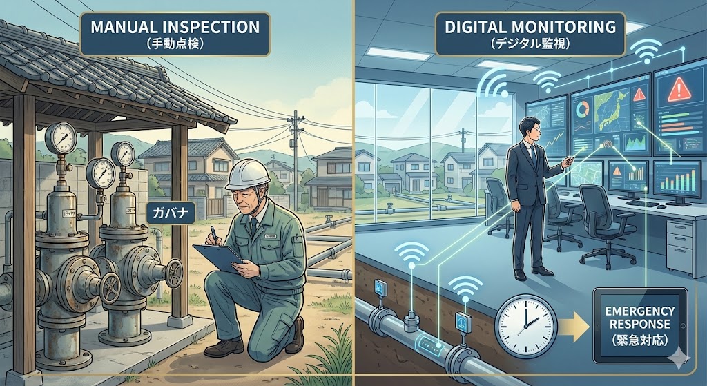 しかし、翔太さんを待っていたのは想像以上に厳しい現実でした。ガバナ(整圧器)の監視は、いまだに作業員が車で巡回して目視確認する方式。バルブの開閉工具も規格がバラバラで、万が一の災害時に近隣事業者から応援が来ても、工具が合わずに作業ができない可能性がありました。